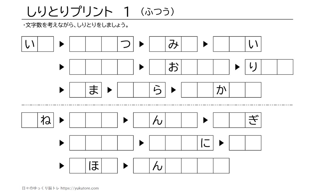 日常の言葉を使用した穴埋めしりとりのプリントです。