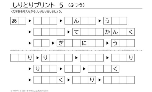 日常の言葉を使用した穴埋めしりとりのプリントです。
