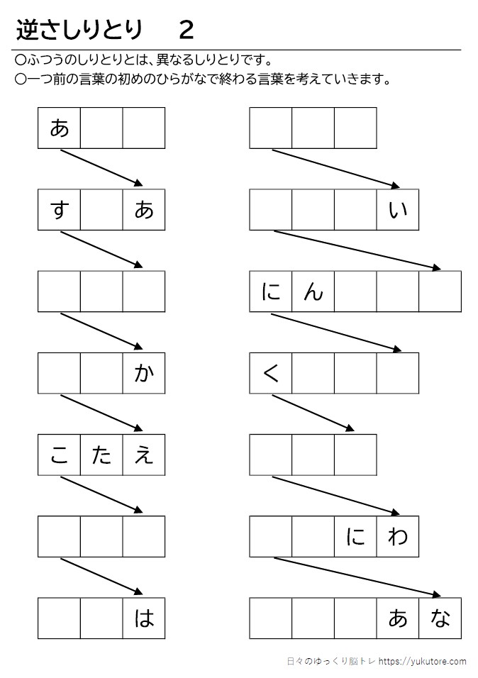 一般的なしりとりよりも難易度は高いものとなっておりますので、脳トレやじっくりと考えたいとき用のプリントとして最適です。